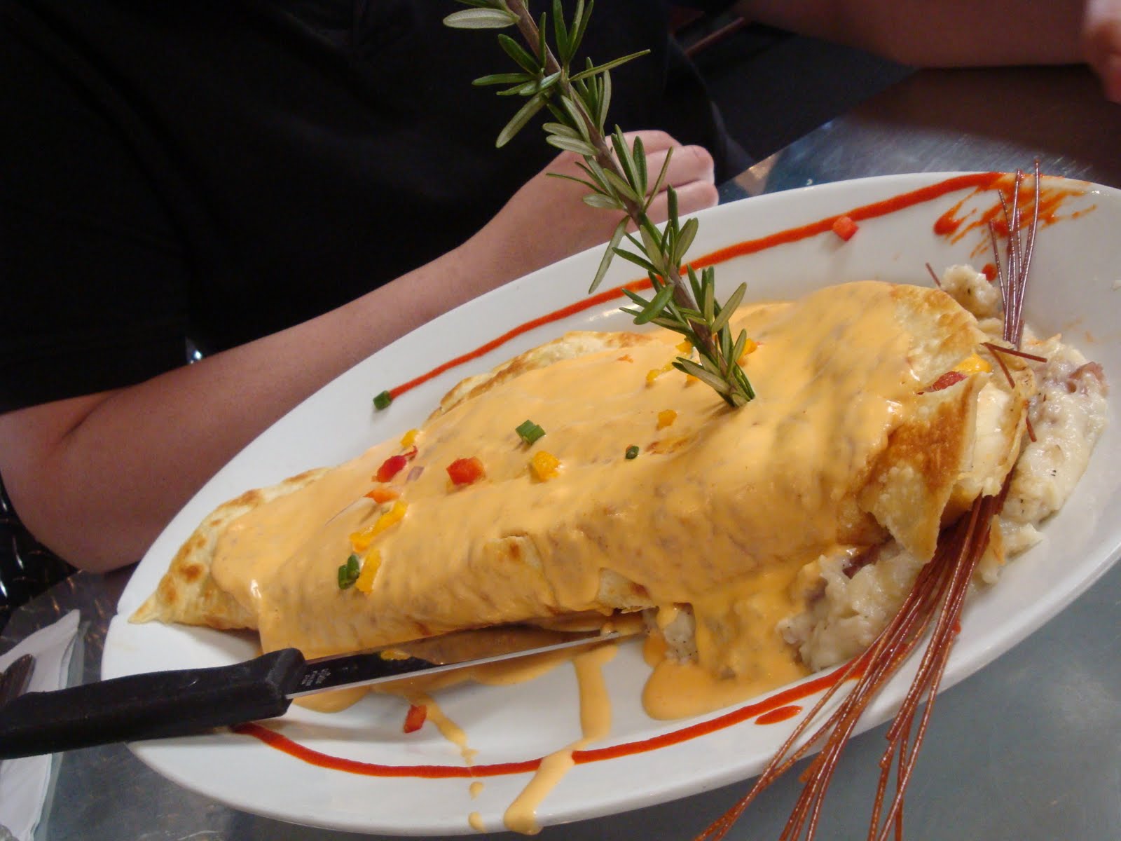 The long wait was worth it! This was my Hash House Quesadilla - stuffed w/ potatoes, jalapenos, eggs, tomato, chili cream: