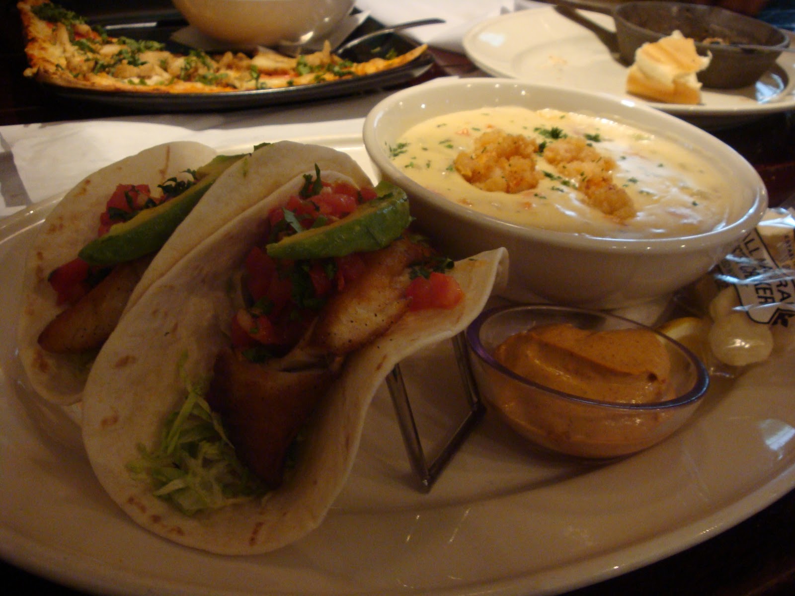 I decided to try this combination meal of Key West Tacos with seafood chowder - comes with flour tortillas filled with sautéed tilapia, avocados, tomato salsa, and crisp iceberg lettuce with ancho-chili sour cream: