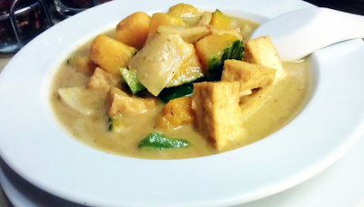 I am quite fond of Thai curry, so fond that I could live off it! I am also fond of Thai Food To Go because this is one of the best Thai restaurants in my area! Despite their name, you can also dine in, which I prefer to do if I'm not busy on the go. On one of my last visits I chose this Pumpkin Curry off the daily specials menu. I think this was technically kabocha squash because of the deep green skin still attached to it. Kabocha is naturally sweet, so it blended well with the curry: