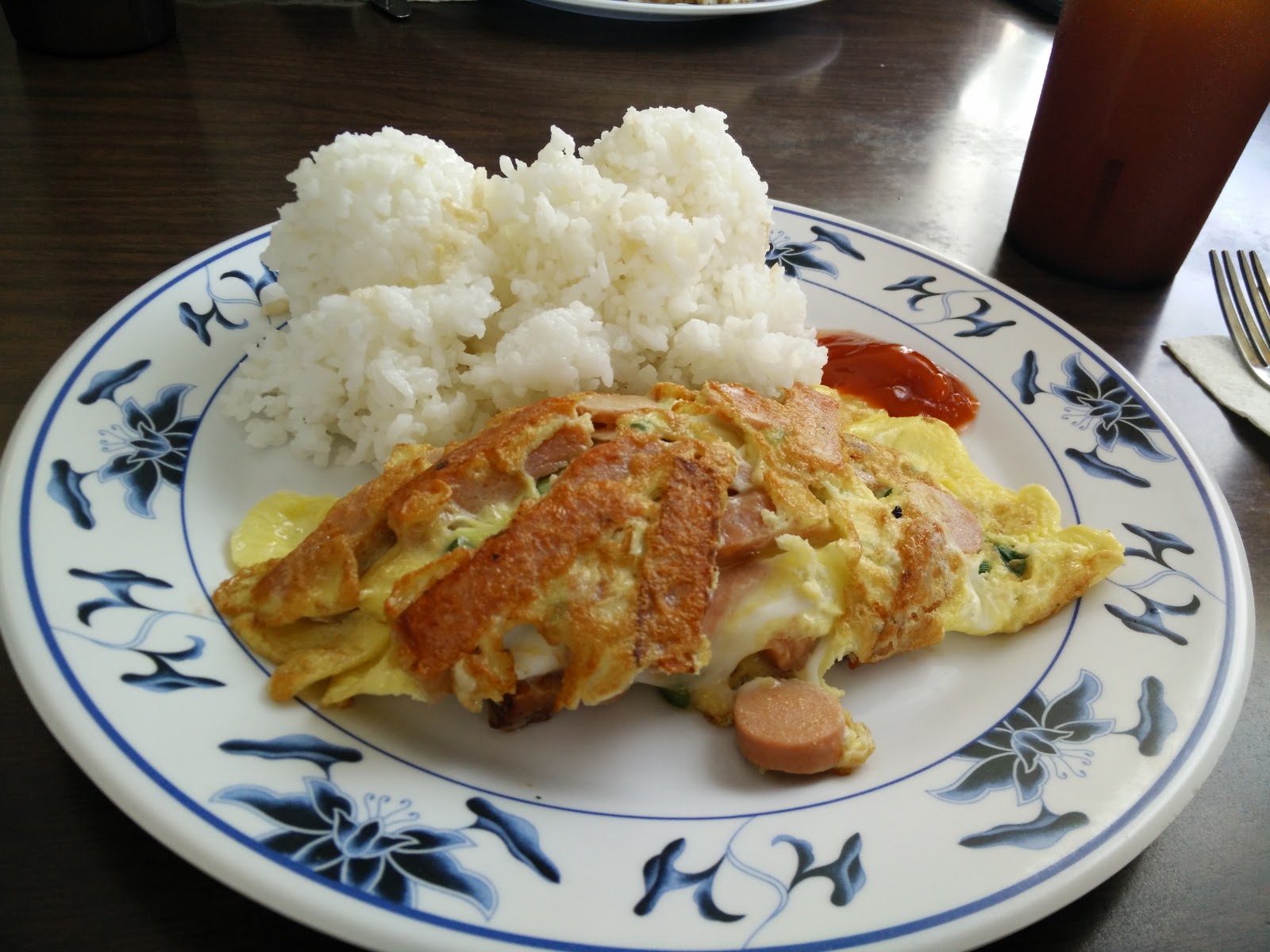 I chose the Crazy Omelette with meats that the Hawaiian locals love- 2 eggs with Spam, Vienna Sausage, Portuguese sausage, and green onions! Despite the variety of meats, I'm glad that one meat didn't overpower the other: