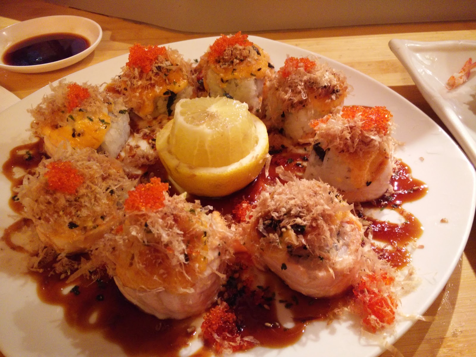 The TNA Roll- California Roll wrapped with salmon topped with scallops and spicy aioli that's baked and garnished with bonito flakes, unagi sauce, tobiko, furikake and comes with a lemon squeeze to top it off: