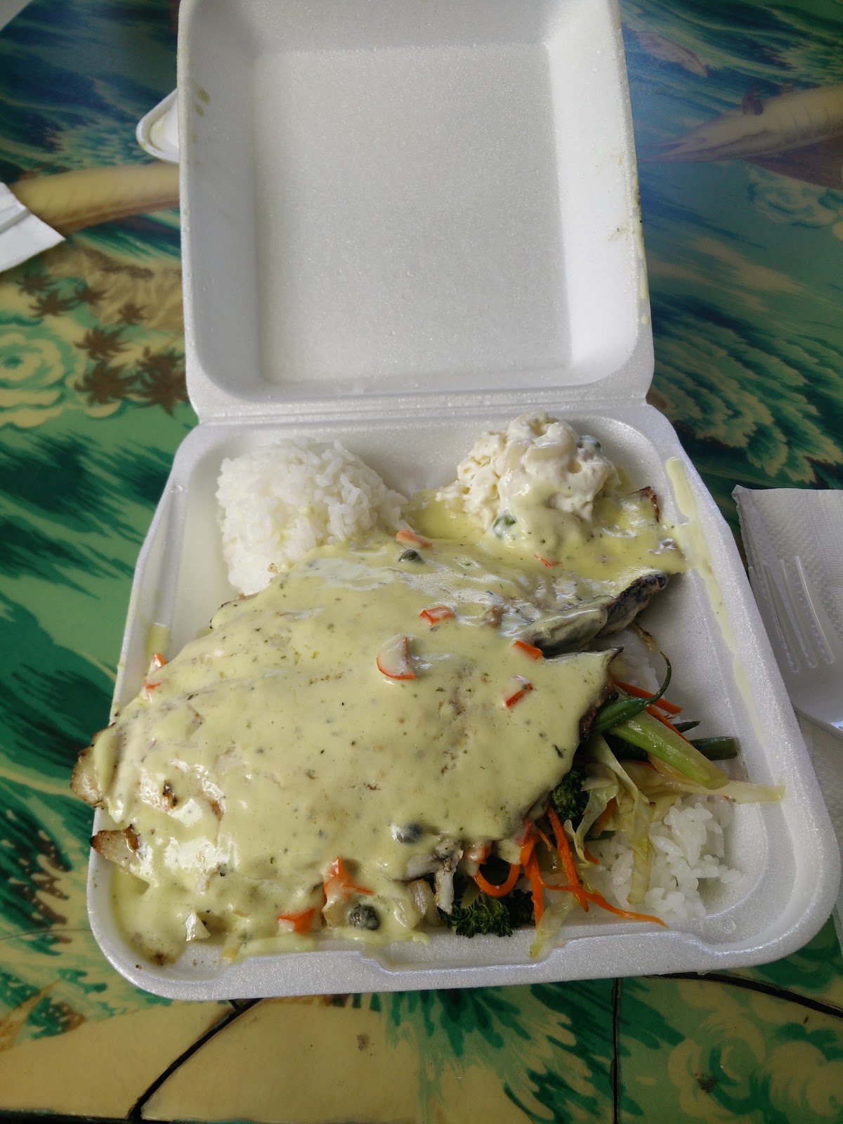 Grilled Ono Fish smothered in some special sauce from Braddah Hutts BBQ Grill: