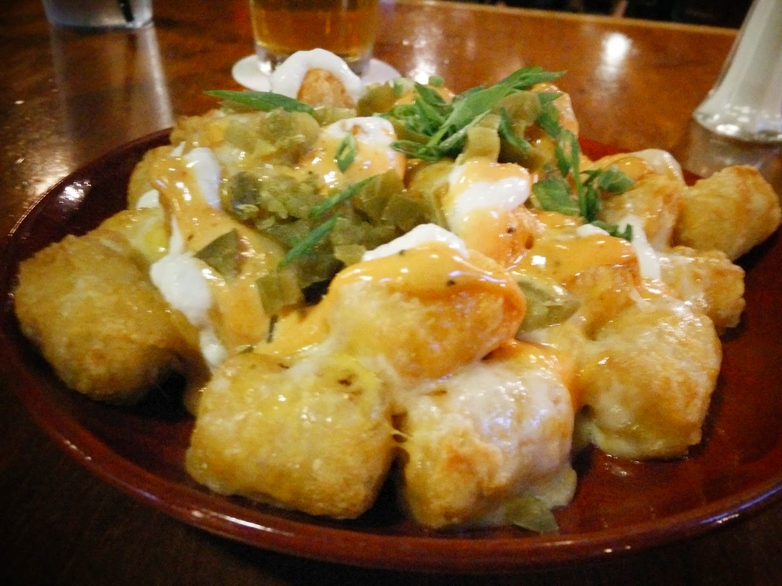 At Maui Brewery Co I ate the best tater tot dish I've ever had, the Tots Dynamite! Comes with cheddar jack and cheese, jalepeño, green onion, kimchi aioli, caramelized onion, and garlic crema: